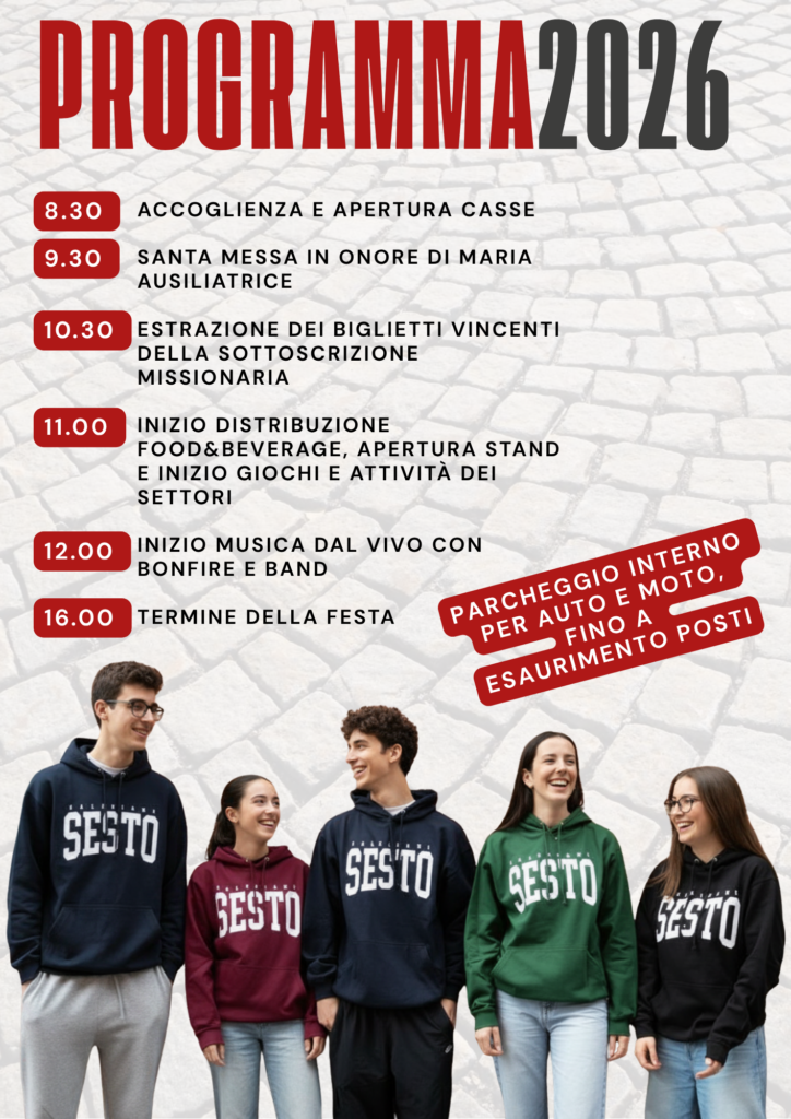 La Festa rappresenta per noi un importante momento di gratitudine e condivisione che prevede la celebrazione della S. Messa alle ore 9.30, l’estrazione della Sottoscrizione Missionaria in favore della Fondazione Opera Don Bosco Onlus, il pranzo e lo svolgimento di diverse e svariate attività e giochi che coinvolgono tutti i settori, dalla Scuola Secondaria di Primo Grado alla Scuola Secondaria di Secondo Grado, dalla Formazione Professionale all’ITS.