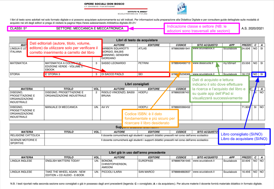Tutti i dati necessari all’acquisto dei libri digitali sono elencati solamente nelle liste ufficiali dell’istituto. È importante concentrarsi sull’acquisto dei libri segnalati come “da acquistare”. Sulle liste dei libri sono anche segnalati libri consigliati e libri dell’anno precedente di cui si segnala l’importanza e la necessità del mantenimento per l’anno successivo. Le liste dei libri sono così strutturate: