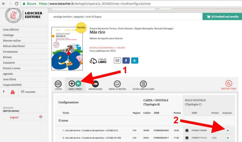 Selezionare la zona “Codici e prezzi” e scorrere fino a trovare il volume desiderato nella modalità “solo digitale – modalità C”