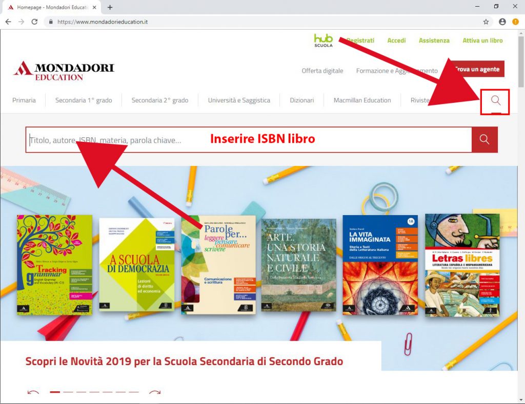 Dopo l’accesso si dovrà cliccare sul pulsante cerca in alto a sinistra (icona lente di ingrandimento) e poi inserire il codice ISBN del testo desiderato.