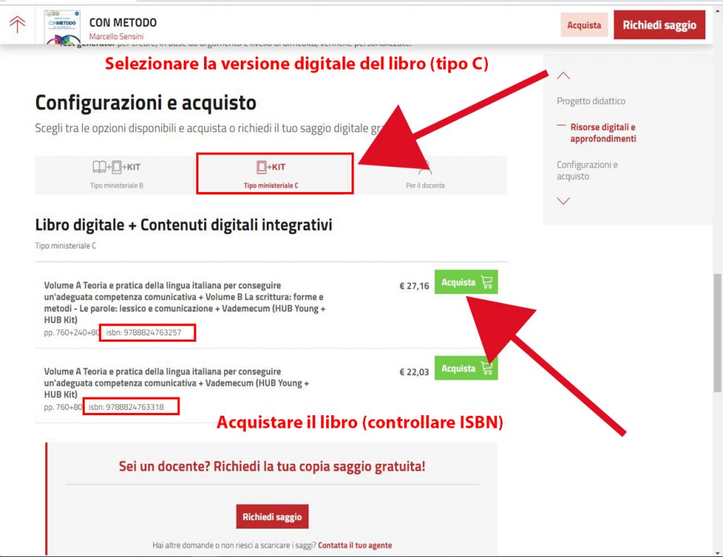 Selezionare la tipologia “Tipologia ministeriale C (digitale)” e poi il volume desiderato. Col tasto “Acquista” si avvia la procedura di pagamento.