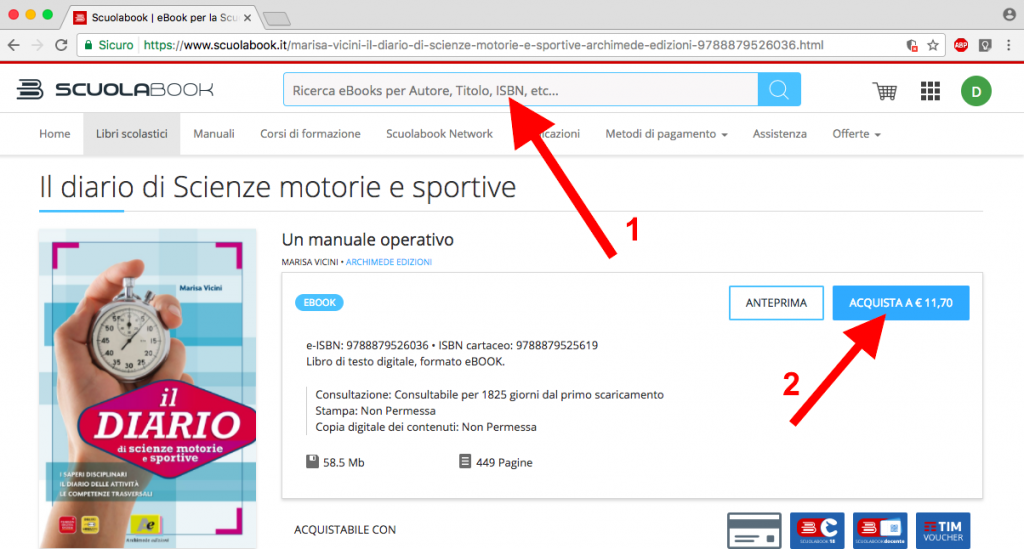 Dopo aver effettuato l’accesso con le proprie credenziali è possibile usare la barra superiore di ricerca per inserire il codice ISBN del libro desiderato. Dopo aver selezionato tra i risultati della ricerca l’opera corretta si accede alla schermata di riepilogo.
