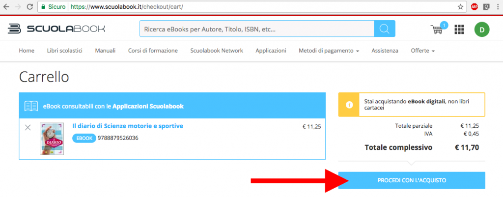 Quando si sono aggiunti al carrello tutti i libri digitali è possibile cliccare sull’icona del carrello in alto a destra di qualsiasi pagina per visualizzare il riepilogo del carrello e avviare la procedura di pagamento.